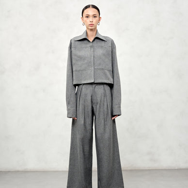 Tailored trousers with a wide leg silhouette. This style features sewn pleated creases at the front and smooth pressed at the back. Finished with a button clasp, side pockets, and a double welt less back pocket. Understated,confident and timeless.