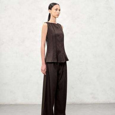 A sleeveless top focus on structure and tailored silhouette. With vertical panelling contours the body softly, creating a subtle hourglass shape that flares slightly at the hem for an elegant, architectural finish. Perfectly clean exterior line, features a hidden clasp button on the inside.